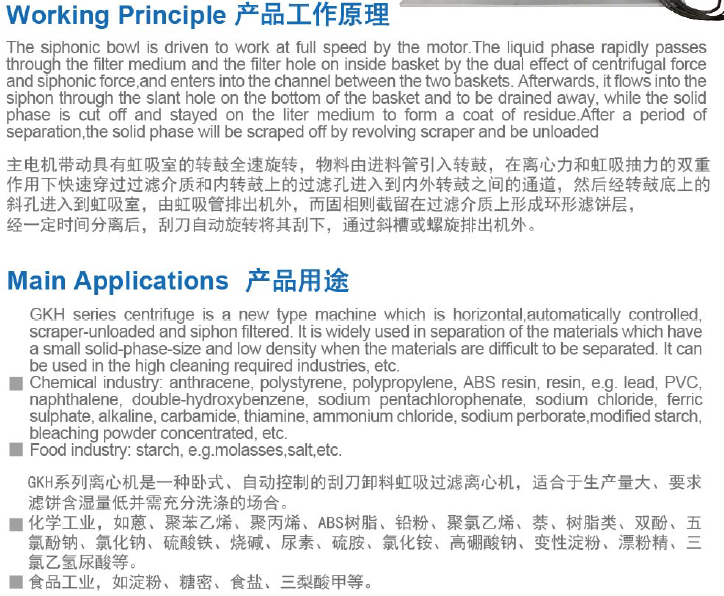 主電機帶動具有虹吸室的轉(zhuǎn)鼓全速旋轉(zhuǎn),物料有進料管引入轉(zhuǎn)鼓,在離心力和虹吸抽力的雙重作用下快速穿過過濾介質(zhì)和內(nèi)轉(zhuǎn)鼓上的慮孔進入到內(nèi)外轉(zhuǎn)鼓之間的通道,然后經(jīng)轉(zhuǎn)鼓底上的斜孔進入到虹吸室,由虹吸管排除機外,而固相則截留在過濾介質(zhì)上形成環(huán)形濾餅層,經(jīng)一段時間分離后,刮刀自動旋轉(zhuǎn)將其刮下,通過斜槽或螺旋排出機外。